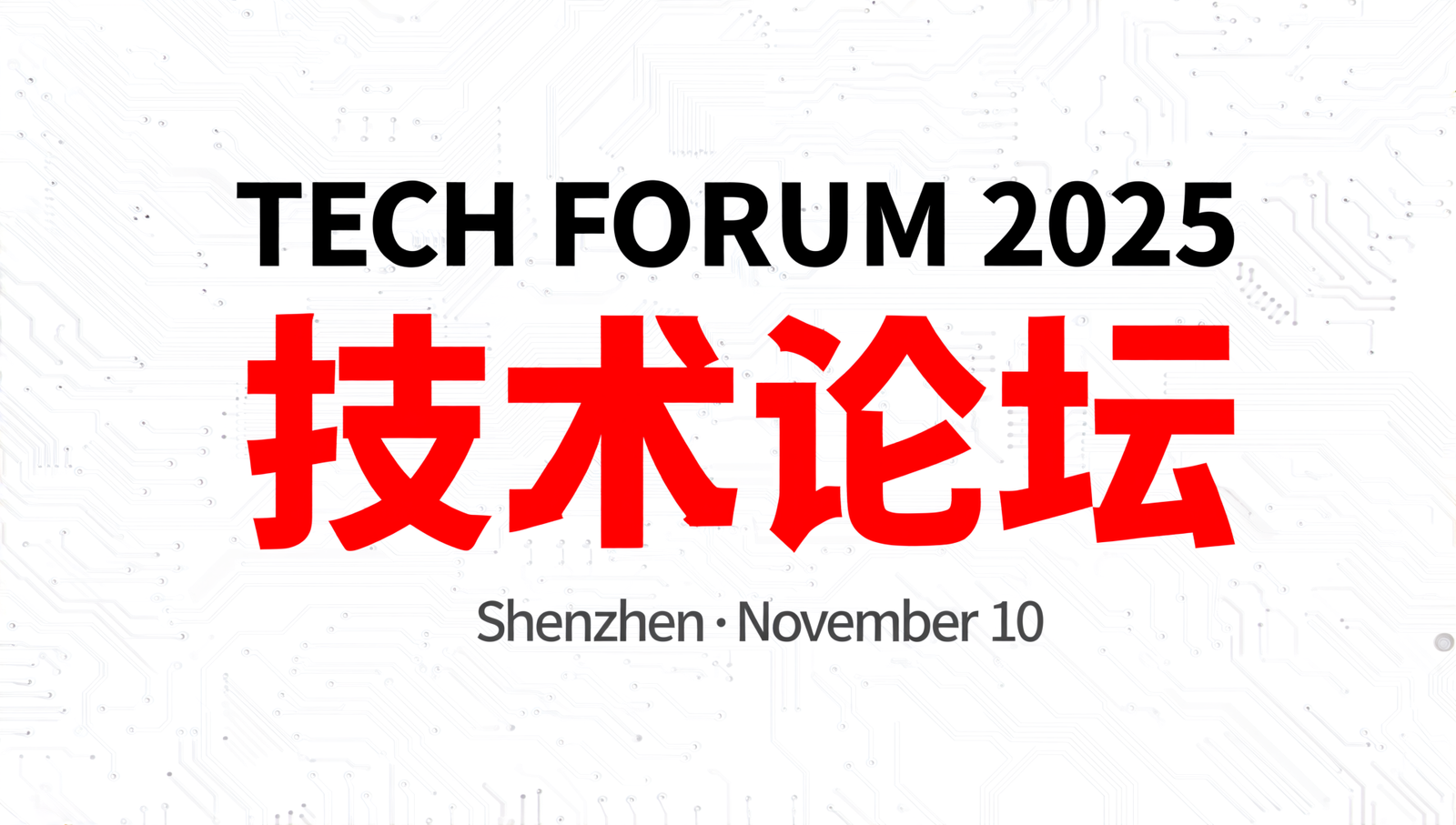 A bilingual event flyer with “TECH FORUM 2025” in large black letters at the top, and “技术论坛” (Tech Forum in Chinese) below it in bold red characters. The bottom text says “Shenzhen · November 10” in grey. White background with subtle circuit patterns.