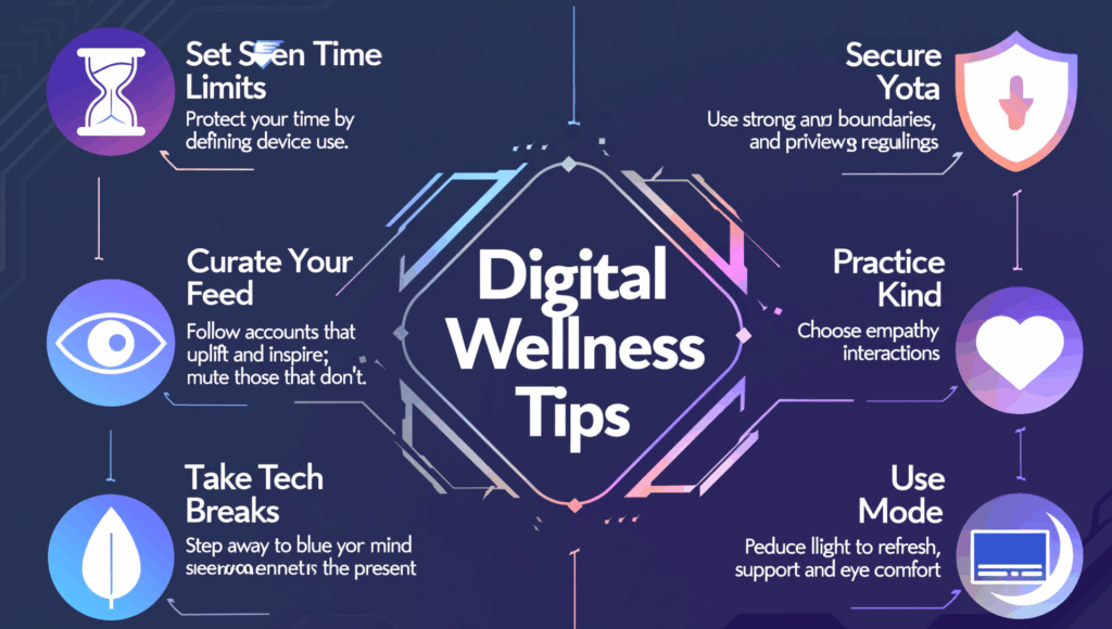 A beautifully designed slide that combines elegant infographic structure with artistic visual elements. The center of the image features the title “Digital Wellness Tips” in graceful serif font, framed by abstract, tech-inspired geometric lines and soft gradients. At the top-left, the phrase “Set Screen Time Limits” appears next to an hourglass icon, accompanied by the sentence: “Protect your time by defining boundaries for device use.” Below it, “Curate Your Feed” is written near an eye icon, followed by: “Follow accounts that uplift and inspire; mute those that don’t.” At the bottom-left corner, “Take Tech Breaks” is displayed next to a leaf symbol, alongside the quote: “Step away to refresh your mind and reconnect with the present.”