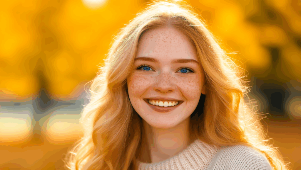 A close-up portrait of a smiling young white woman with freckles, blue eyes, and long wavy blonde hair. She’s wearing a light sweater, standing against a softly blurred autumn park background with golden leaves. Warm lighting, photorealistic style, 16:9 framing.