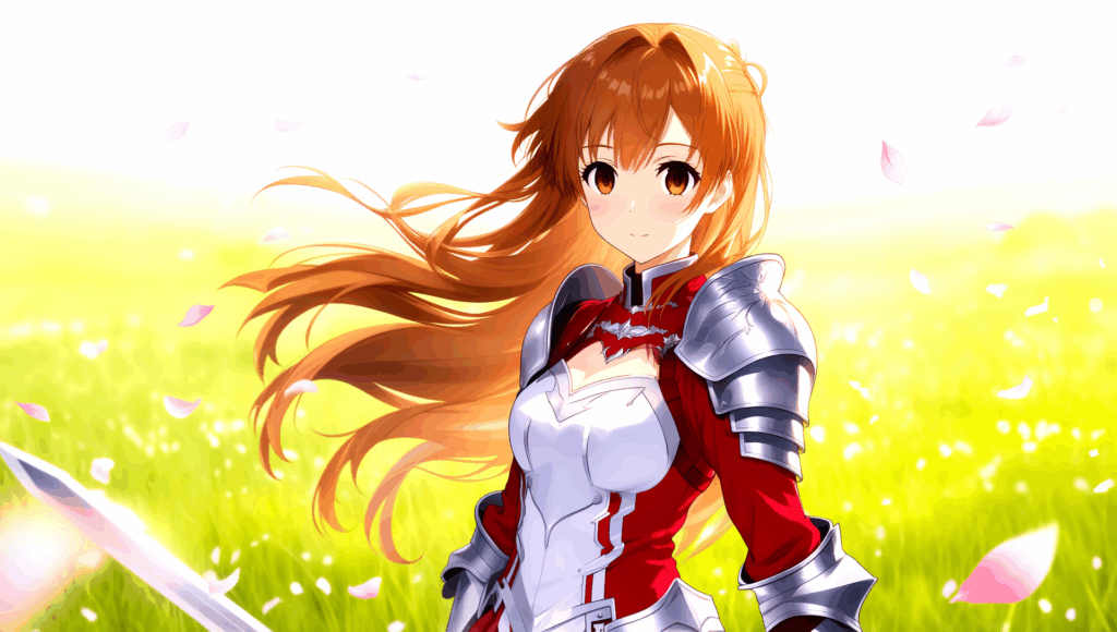 A highly detailed anime-style portrait of Asuna Yuuki from Sword Art Online, wearing her iconic red and white Knights of the Blood uniform with silver armor accents. Long chestnut hair flowing in the wind, warm brown eyes, standing in a sunlit meadow with petals drifting in the breeze. Soft pastel color palette, sharp linework, vibrant shading, 16:9 composition.