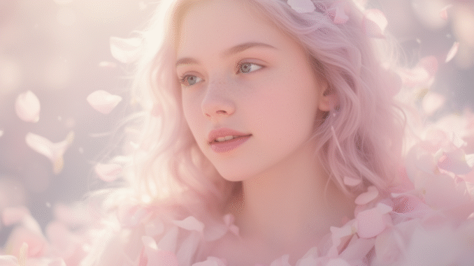 dreamy portrait of a girl surrounded by soft petals, pastel tones, glowing sunlight, gentle bokeh, airy atmosphere, delicate skin texture