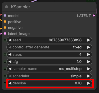 The KSampler is the same, but pay attention to denoise. In text to image workflows, denoise is almost always 1. But in image to image workflows, you might want to keep this number small. In image-to-image workflows, the denoise value controls how strongly the model is allowed to change the input image. Lower denoise values keep the original composition, identity, and structure intact while refining details like lighting, texture, and realism. Higher denoise values give the model more freedom to reinterpret the image, which can improve overall quality but may also introduce composition or identity drift. For Z-Image-Turbo, image-to-image works best as a refinement step, so starting with a low to mid denoise range (0.1 to 0.4) is usually recommended.