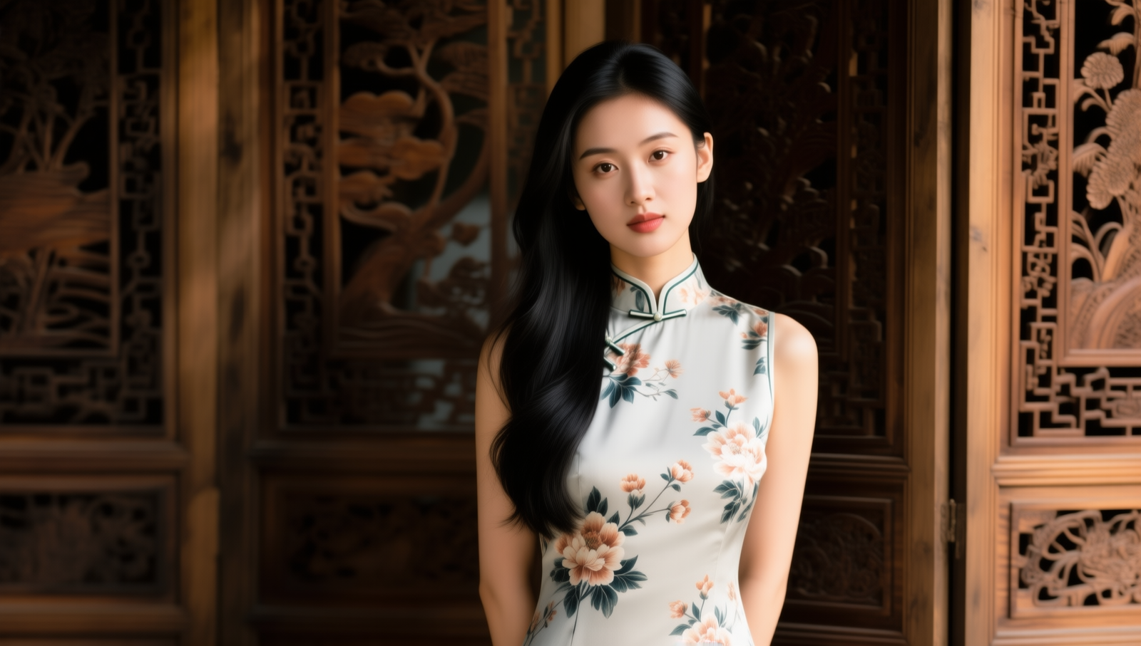 A portrait of a beautiful young Chinese woman wearing a modern qipao dress with floral patterns. Soft natural lighting, long black hair flowing over one shoulder, standing in front of a traditional wooden screen with carved details. Cinematic depth of field, warm tone. 16:9 composition.