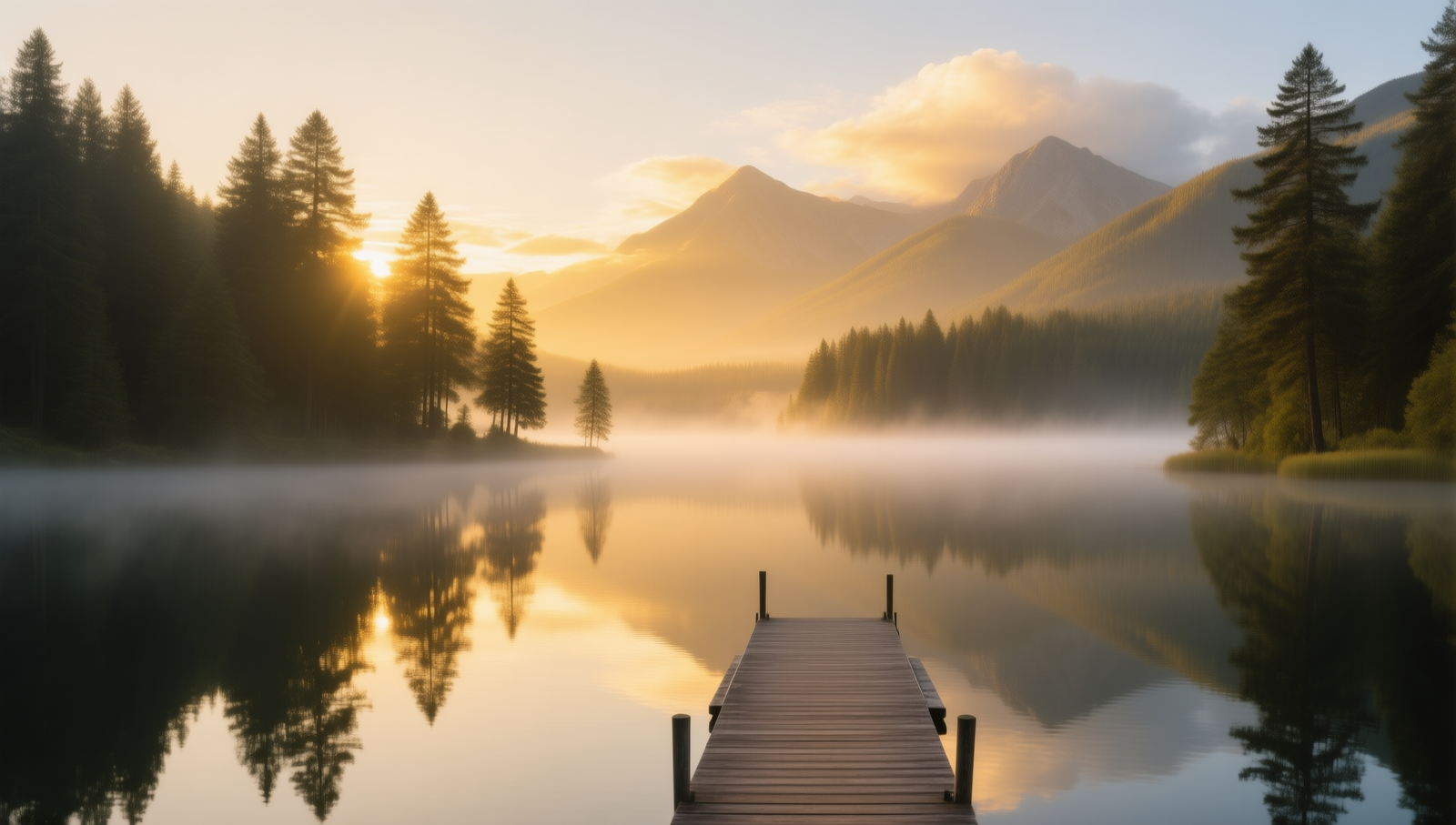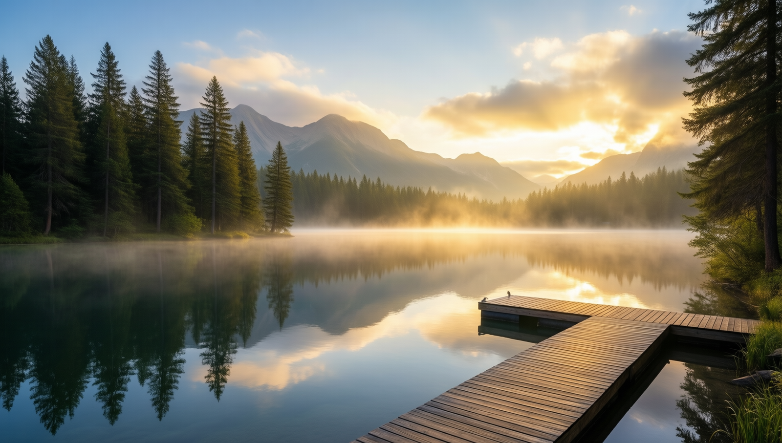 A peaceful lakeside landscape at sunrise, with mist floating over calm water, pine trees reflecting on the surface, and a wooden dock stretching into the lake. Mountains in the distance, golden sunlight breaking through the clouds. Ultra-realistic, wide-angle 16:9 view.