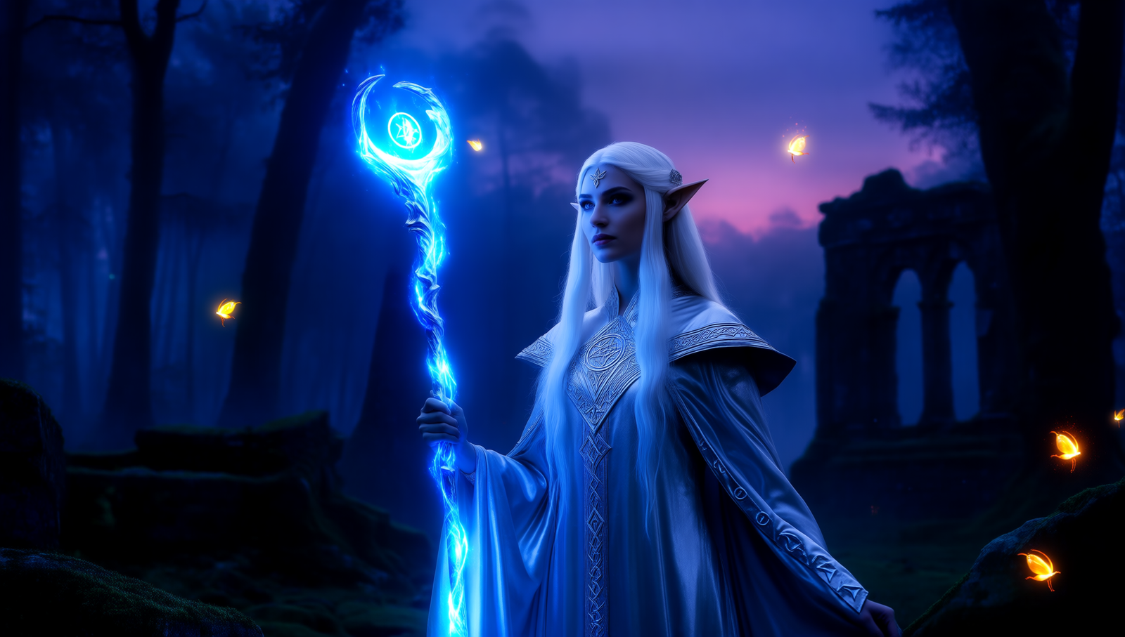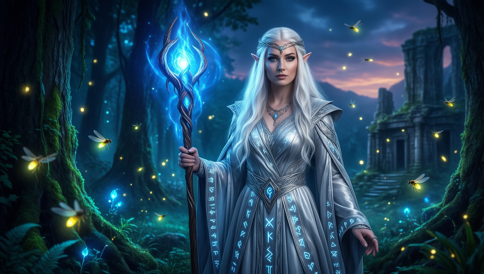 A mystical elven sorceress standing in a glowing forest at twilight, wearing a flowing silver robe with arcane symbols. Long white hair, pointed ears, and a magical staff emitting blue light. Floating fireflies surround her, with ancient ruins in the background. Cinematic fantasy atmosphere, rich color grading
