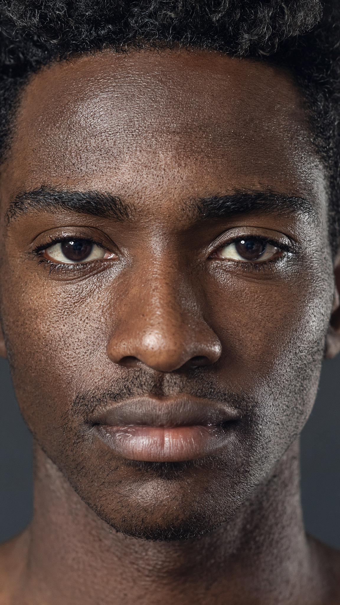 Hyper-realistic close-up portrait of a Black man with deep rich skin texture, natural sheen, tight curls, expressive warm eyes, subtle facial hair, precise shadows, Rembrandt lighting, extremely detailed pores, realistic highlights, neutral dark background, professional portrait look, ultra-sharp realism.
