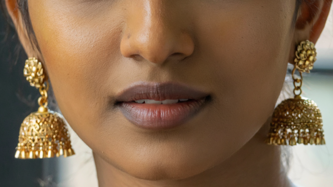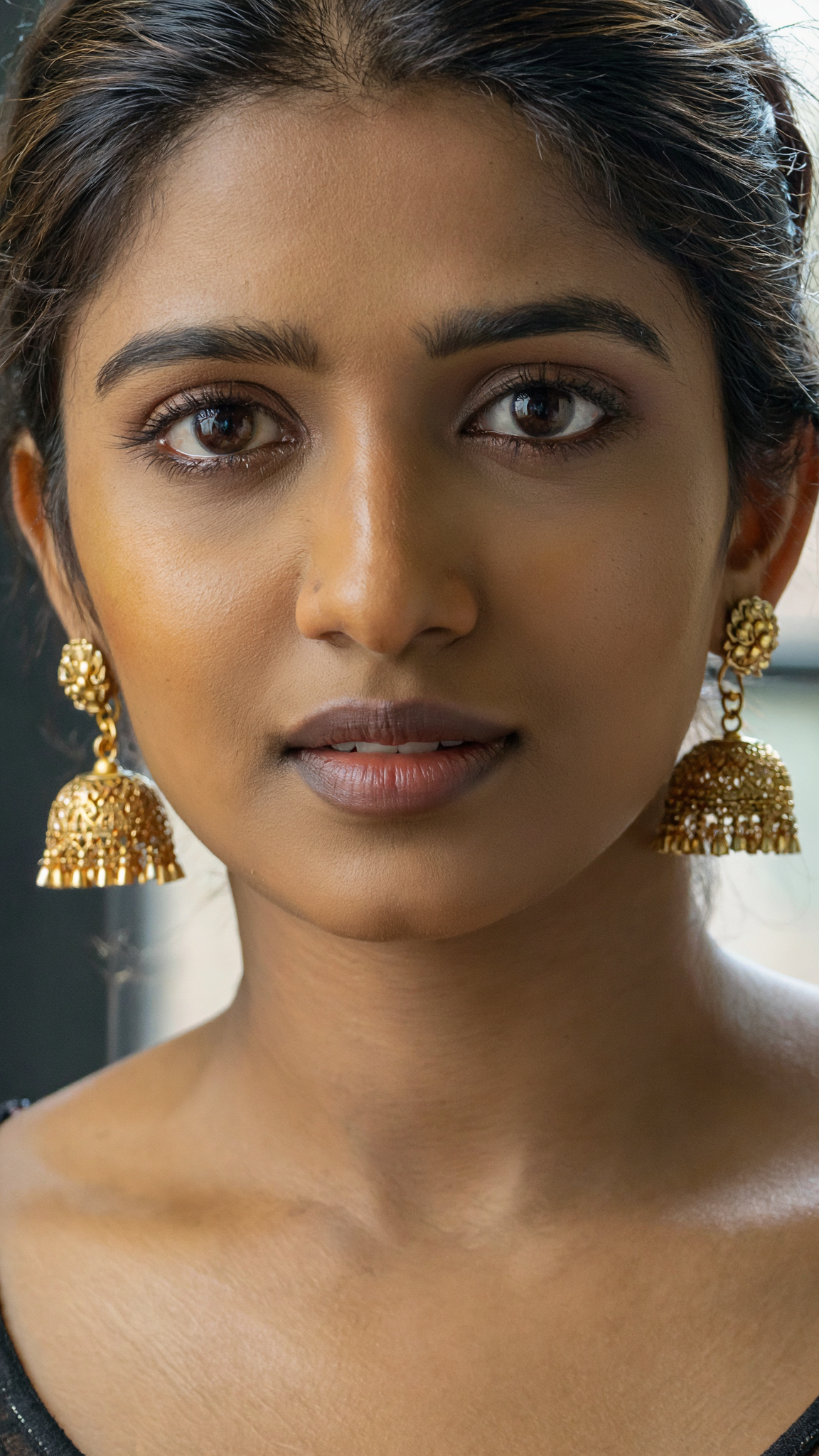 Ultra-detailed portrait of a South Asian woman wearing traditional gold earrings, soft warm skin tone, intricate hair strands, authentic facial texture, natural makeup, ambient window light, soft bokeh background, lifelike colors, elegant realism, 8K clarity, professional studio depth of field.