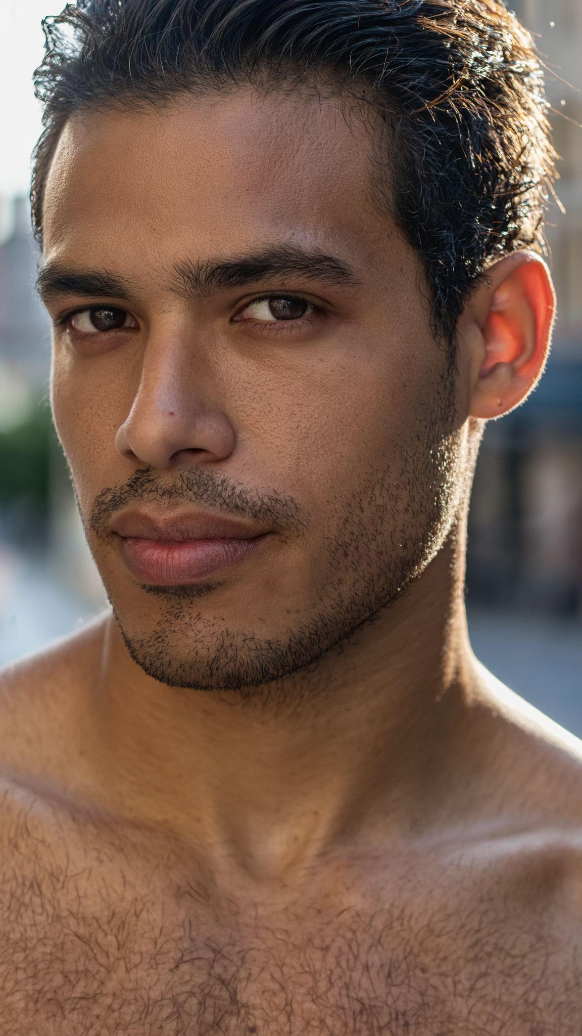 Photorealistic portrait of a Latino man with defined jawline, subtle beard texture, sun-kissed skin, detailed pores, warm directional sunlight, slight backlight rim on hair, soft bokeh city background, crisp sharp focus on the eyes, authentic natural expression, HDR realism.