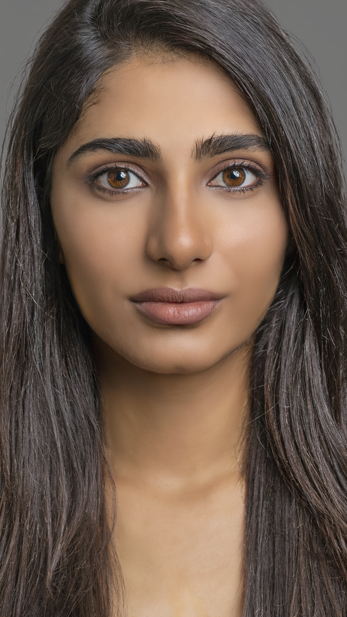 Ultra-realistic portrait of a Middle Eastern woman with expressive eyes, long dark hair, smooth warm olive skin tone, subtle makeup, natural reflections in the eyes, fine eyebrow details, high-precision lighting, matte background, strong facial realism, soft cinematic shadows.